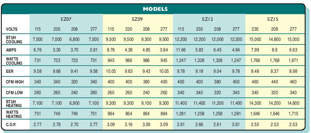 Heating capacities specified in accordance with ARI standard 380-82 at conditions of 47^FWB outdoor and 70^F DB/60^FWB indoor. Wattage,Amperage, COP. EER listings include compressor, evaporator motor and condenser fan motor.Cooling capacities specified in accordance with ARI standard 380-82 at conditions of 95^F DB/75^FWB outdoor and 80^F DB/67^FWB indoor.