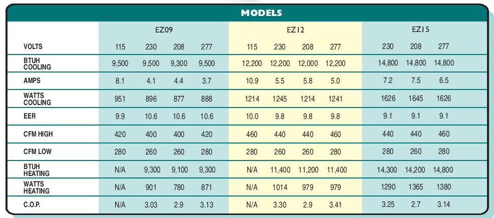 Heating capacities specified in accordance with ARI standard 380-82 at conditions of 47^FWB outdoor and 70^F DB/60^FWB indoor. Wattage,Amperage, COP. EER listings include compressor, evaporator motor and condenser fan motor.Cooling capacities specified in accordance with ARI standard 380-82 at conditions of 95^F DB/75^FWB outdoor and 80^F DB/67^FWB indoor.